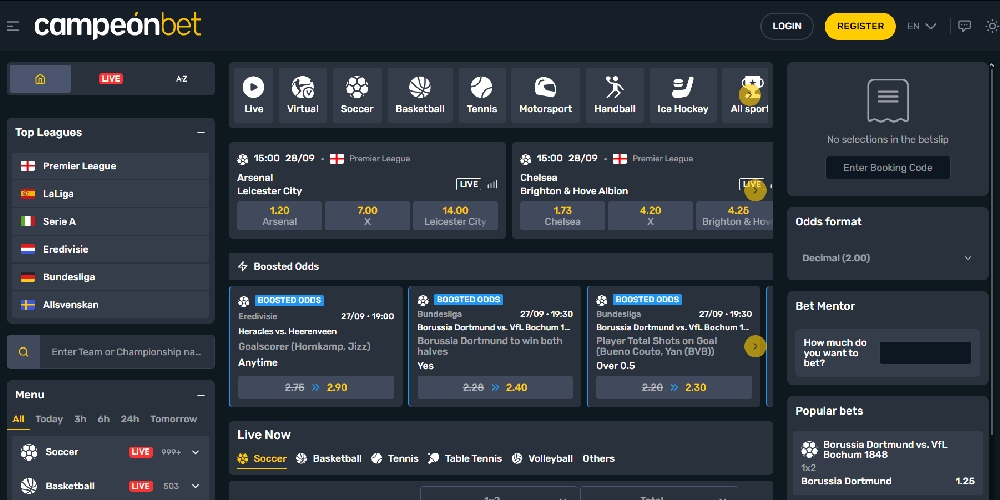 Mit über 35 verschiedenen abgedeckten Sportarten, darunter Fußball, Basketball, Pespallo und Wasserball, bietet der Pre-Match-Teil von Campeonbet.com eine Gesamtauszahlung von 94 %. Beim Wetten auf Fußball sind die Chancen für das WDW in den großen Ligen hoch, aber deutlich niedriger, wenn zusätzliche Optionen wie Asian Handicaps und Over/Under verwendet werden. Karten, Ecken und Spieler-Specials sind nur einige der Hunderten von Märkten, die Wettenden zur Verfügung stehen.