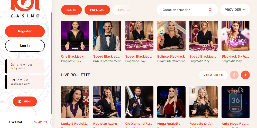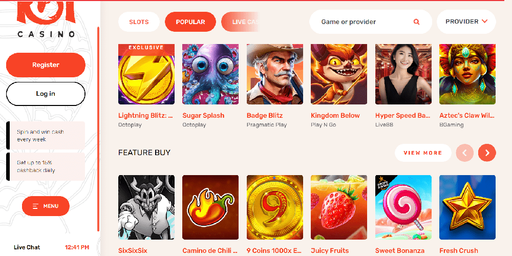 There are thousands of titles available at Koi Casino's enormous library. Play blackjack, video poker, and a plethora of popular video slots all on one convenient website. Although there are many slot machines, the range of virtual table games is somewhat restricted, with only two options. Luckily, there are plenty of search and filter options, so even the massive collection is easy to navigate. What this implies is that your preferred games will be easy to locate. You may test out virtual games for free before committing to real money wagers by playing the demo versions. A live casino feature is also available on Koi. Roulette, blackjack, dragon tiger, and Crazy Time dealers are available in one of seven inside lobbies.