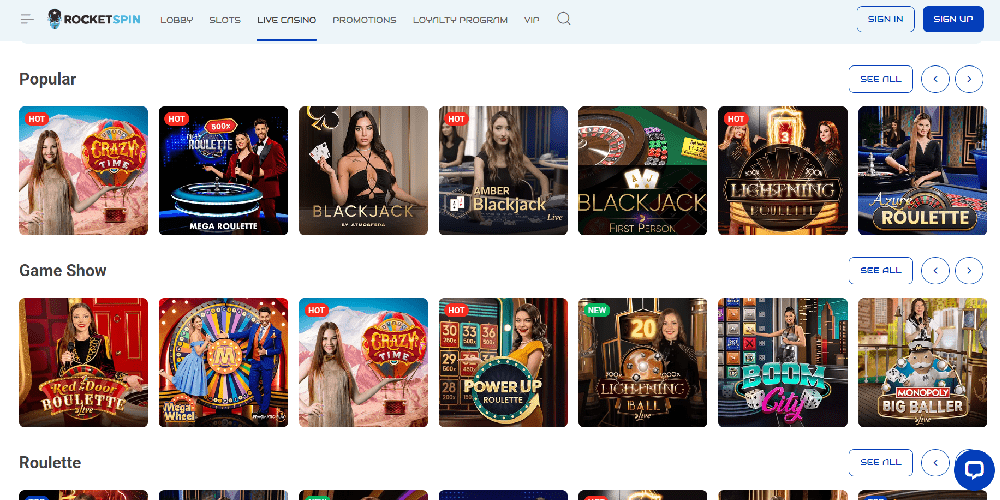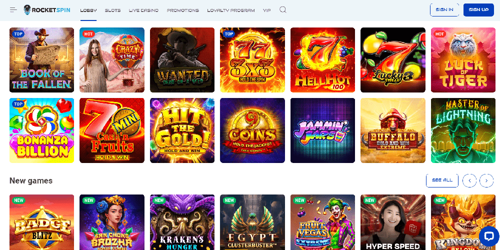 Over seks tusen spill laget av kjente utviklere er tilgjengelig på Rocketspin. Spilleautomater på dette kasinoet inkluderer et bredt utvalg av temaer og funksjoner, inkludert jackpotspill, bonuskjøpsalternativer, Megaways og umiddelbare gevinstspill, slik at spillere kan finne noe de liker. Du kan spille spilleautomater, bordspill og til og med live dealer-alternativer som baccarat, blackjack, rulett, poker og spillprogrammer i kasinoets omfattende spillbibliotek.